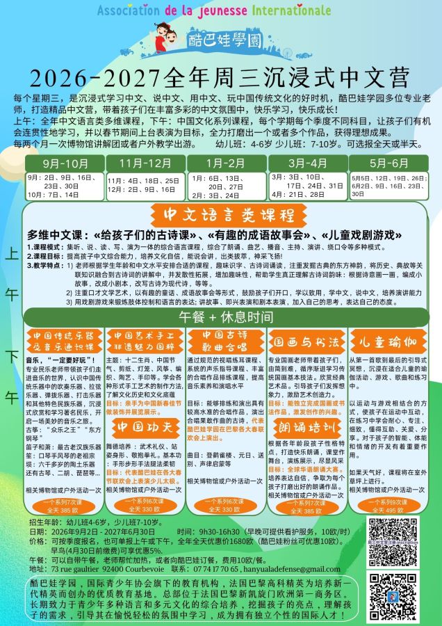 酷巴娃学园2026-2027年周三全天中文营来啦!